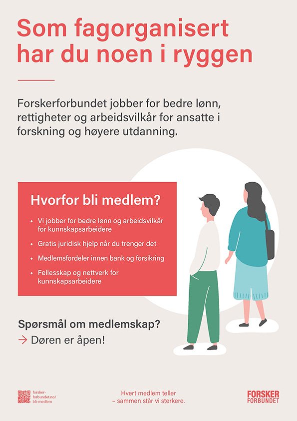 Plakat for kontordør som synliggjør fordeler med medlemskap i Forskerforbundet og inviterer til samtale om fagorganisering. Skrives ut i ønsket format
